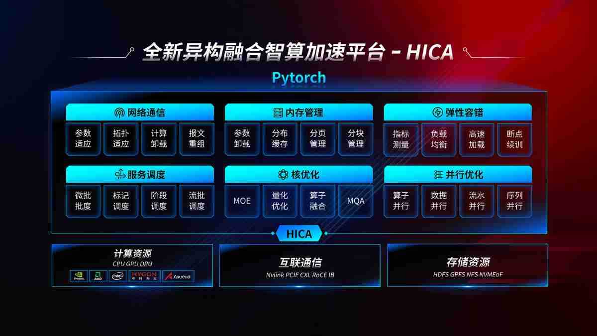 通过自研的服务层、、、中间适配层、、、、以及调度编排算法,,,,采用数据并行、、模型并行等多种并行方式,,,把并行计算任务进行有效的分解,,使其分别由相应的软件栈和算力资源来承接。。当GPU资源变化,,HICA可以实时动态调度计算子任务并调整模型拓扑和架构,,,以充分聚合各种算力资源。。。