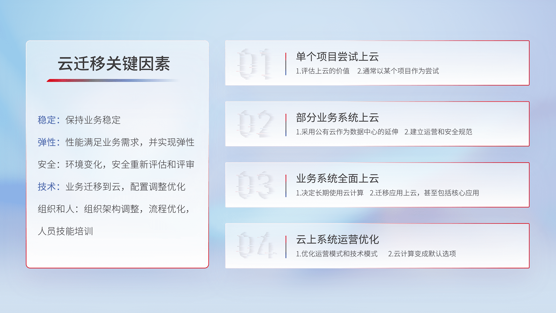 结合实际业务,,从规划设计、、云平台选型、、、、云原生改造、、数据迁移、、、、集成交付,,,迁移全过程为客户识别最佳上云路径,,,做好风险识别管理,,,,设计网络架构、、、身份权限、、、、安全审计合规、、、操作审计、、、、日志审计、、、监控告警策略、、、多站点容灾设计等,,,,对云上基础设施进行整体规划,,提升IT治理水平,,以满足弹性、、高可用、、、高性能的需求。。。