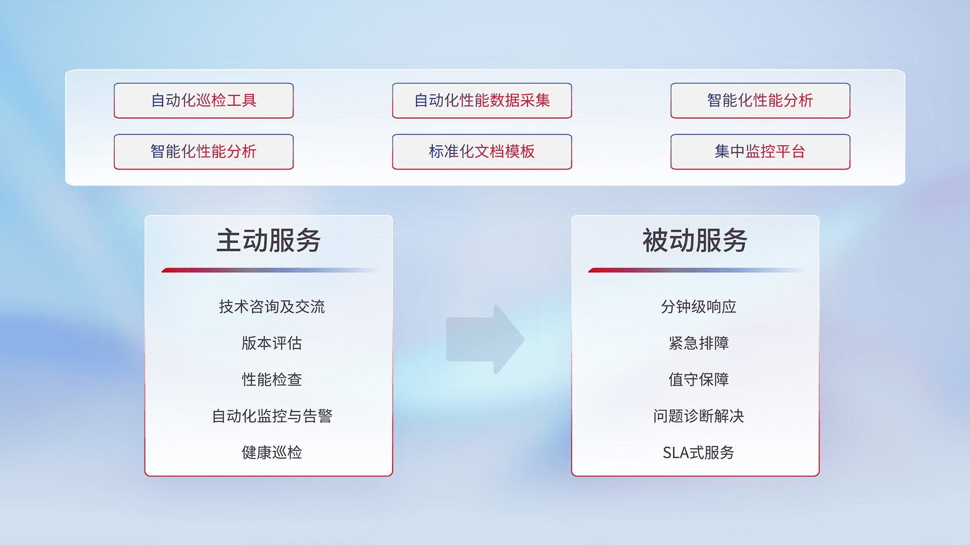 智能化工具和标准化文档,,,保障服务质量,,,提供主动服务(包含技术咨询、、版本评估、、、、性能检查、、自动化监控与告警、、健康巡检)和被动服务包含(分钟级响应、、紧急排障、、、值守保障、、问题诊断解决、、、、SLA服务)。。。